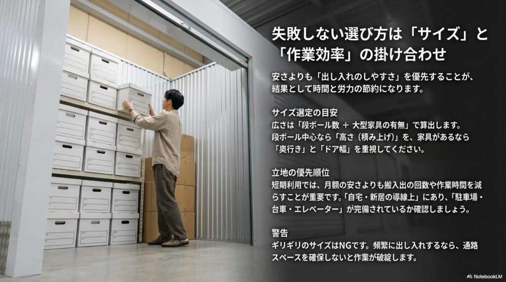 ただし、短期利用こそ料金の仕組みやサイズ選び、そして荷物移動の手配を理解していないと、想定外の手間や費用が発生しがちです。