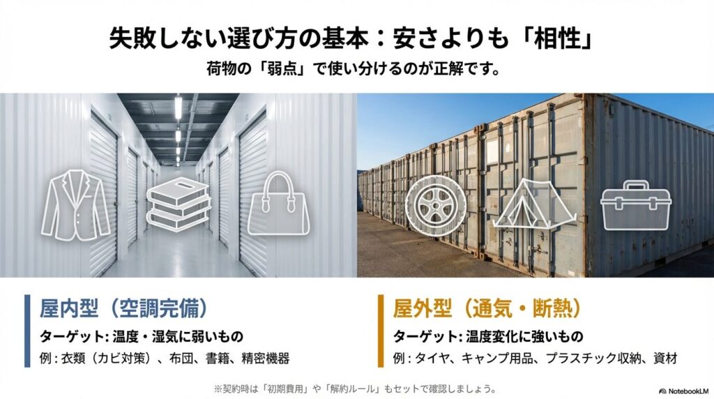 屋内型か屋外型か、空調・断熱・換気といった保管環境、そして預ける物の性質で、最適解が変わります。