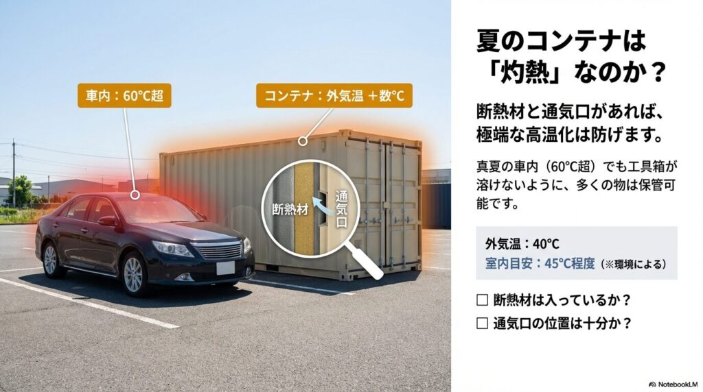 夏の屋外型コンテナは、条件によっては外気温より数℃高くなる可能性がありますが、