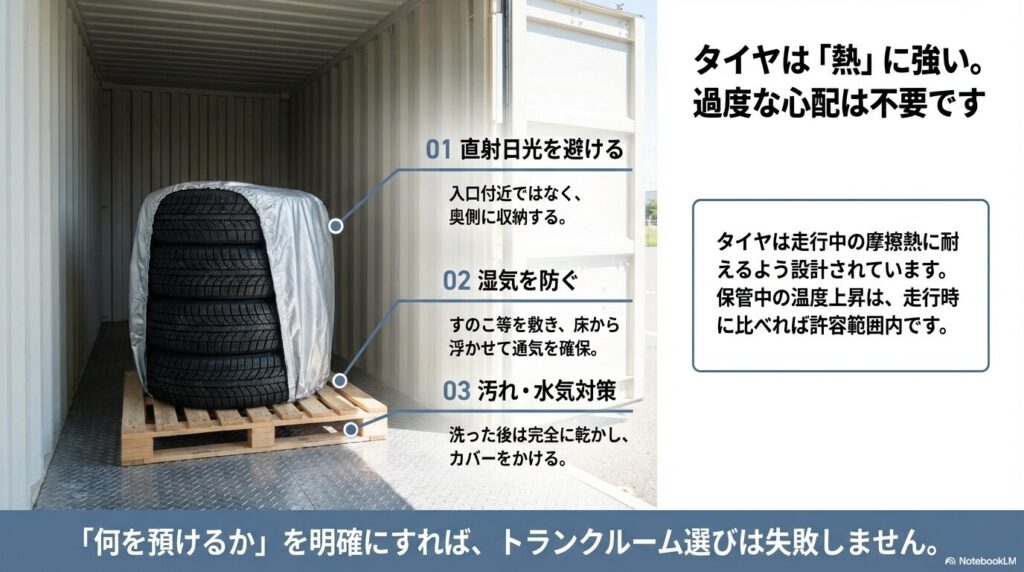 この記事では、トランクルーム選びの基本(料金相場・選び方・注意点)を押さえたうえで、“夏の温度”と“タイヤ保管は大丈夫か”という実務的な疑問にフォーカスして、後悔しない判断基準をまとめます。
