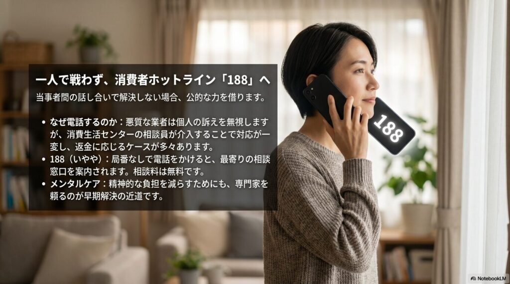 当事者同士の話し合いで解決しない、あるいは相手の態度が高圧的で話にならない場合は、第三者機関である「消費生活センター」に相談することを強くおすすめします。