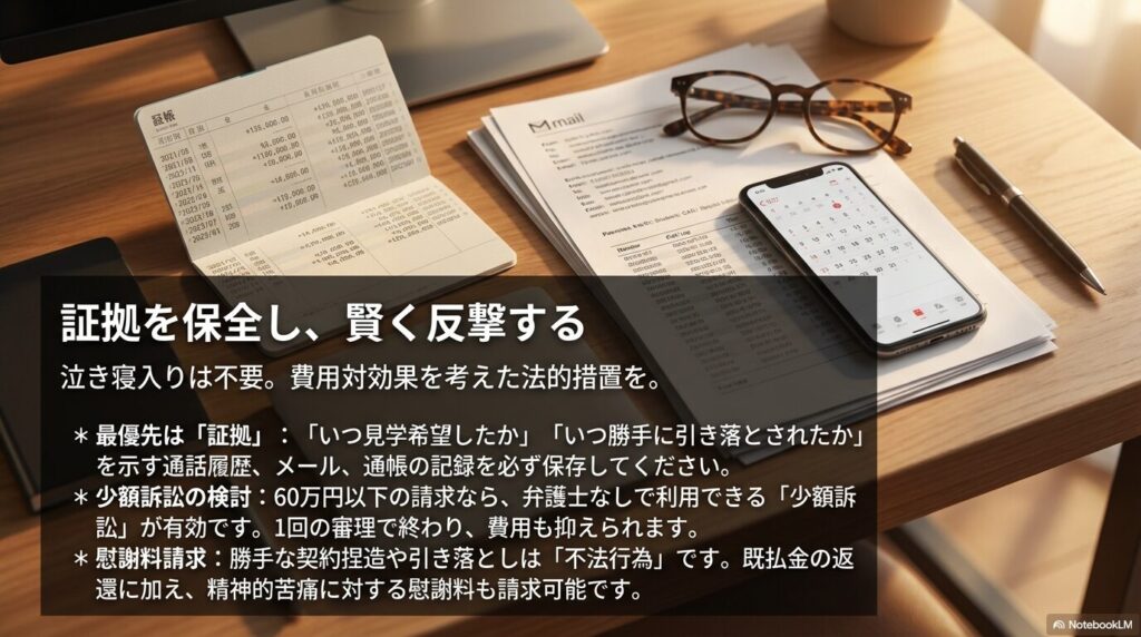 まずは冷静になり、証拠を集めた上で、毅然とした態度で返金を求めましょう。