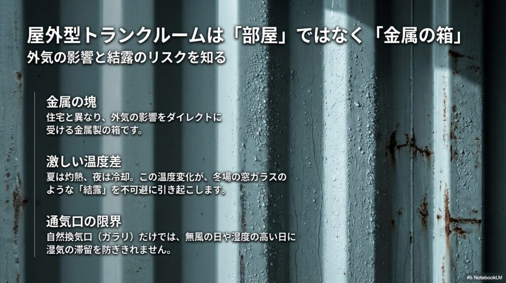 このような疑問を持つ方は非常に多いです。結論から申し上げますと、屋外型トランクルームの湿気対策は、想像以上にシビアな現実があります。