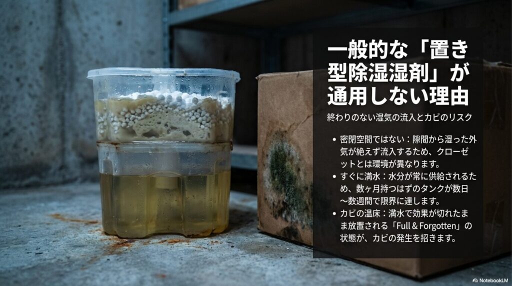 - 気密性が低いため、家庭用の除湿剤では湿気の流入に追いつかないことが多い。