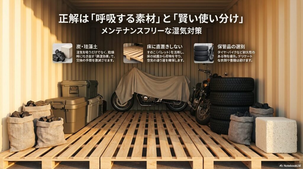 頻繁に足を運べないトランクルームだからこそ、メンテナンスフリーに近い素材を選ぶことが、継続的な湿気対策の鍵となります。