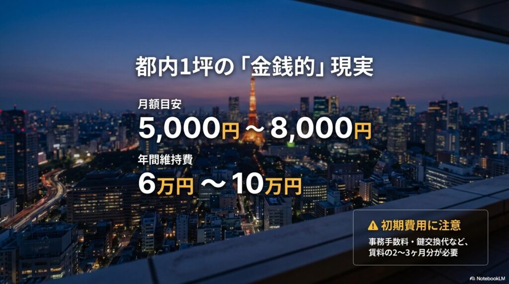 まず結論からお伝えすると、都内で1坪のトランクルームを借りる場合、月額5,000円から8,000円程度を目安に探すことができます。