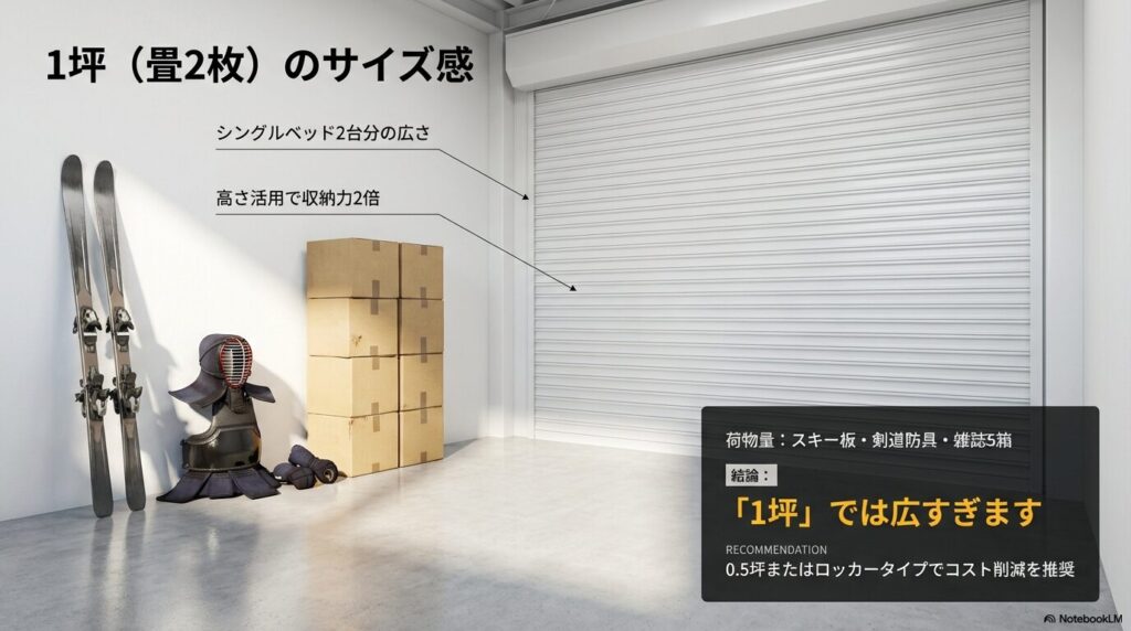 なぜなら、1坪は「畳2枚分」の広さがあり、高さも活用できるからです。一般的なトランクルームの高さは2メートル以上あることが多く、空間を立体的に使えます。