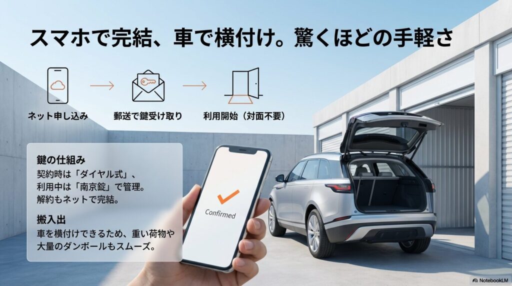 ネットで完結する契約手続きや、車で横付けできる利便性は、忙しい引っ越し準備の強い味方となってくれます。