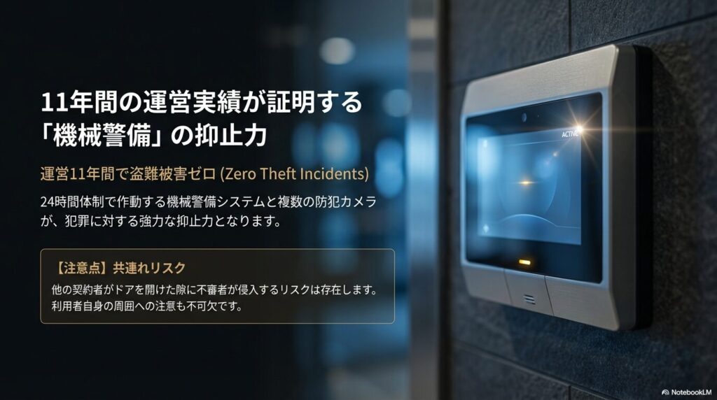 防犯カメラが複数台設置され、24時間体制で警備システムが常に作動している環境は、犯罪を企てる者に対して強力な抑止力として働いていると考えられます。